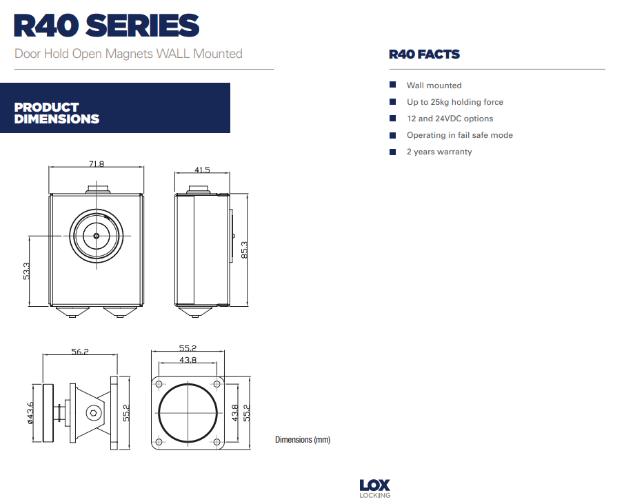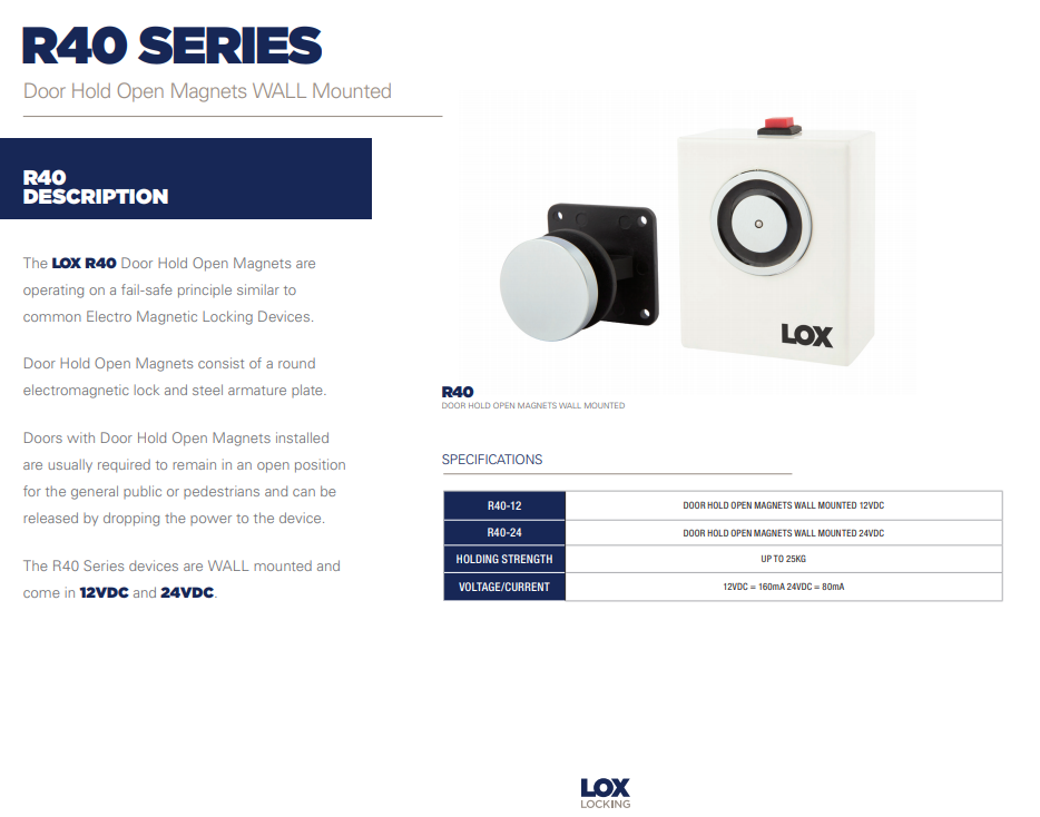 FThe LOX R40 Door Hold Open Magnets are operating on a fail-safe principle similar to common Electro Magnetic Locking Devices. Door Hold Open Magnets consist of a round electromagnetic lock and steel armature plate. Doors with Door Hold Open Magnets installed are usually required to remain in an open position for the general public or pedestrians and can be released by dropping the power to the device. The R40 Series devices are WALL mounted and come in 12VDC and 24VDC.