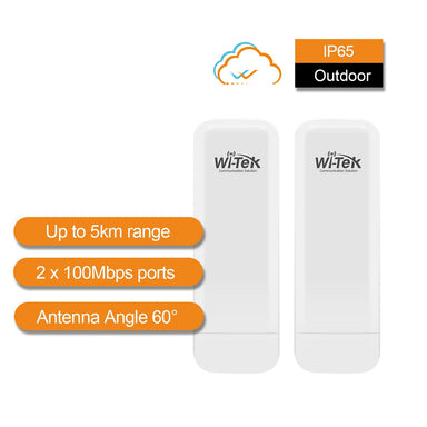 Wi-Tek External Wireless Bridge Kit, 100Mbps, 5GHz, 2 x 48VDC POE Injectors, IP54 (Up To 5KM Range)